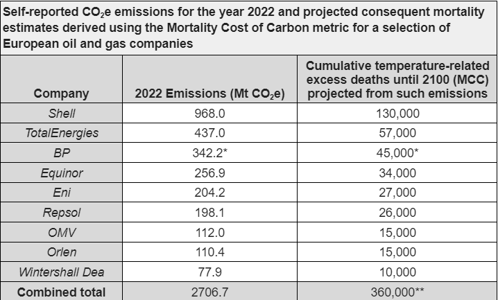 Metodologie. Acest raport utilizează metode statistice pentru a estima numărul de decese în exces care ar putea apărea înainte de sfârșitul acestui secol ca urmare a emisiilor de gaze cu efect de seră ale companiilor producătoare de combustibili fosili. Scopul acestei cercetări este de a înțelege și de a ilustra măsura în care viitoarele schimbări climatice sunt atribuibile emisiilor de carbon actuale și viitoare ale companiilor de combustibili fosili. Nouă companii de petrol și gaze cu sediul în Europa au fost incluse în acest studiu: Shell, TotalEnergies, BP, Equinor, Eni, Repsol, OMV, Orlen și Wintershall Dea. Toate aceste companii sunt active la nivel internațional și majoritatea acoperă întregul proces, de la producția de petrol și gaze naturale la consumatorul final.