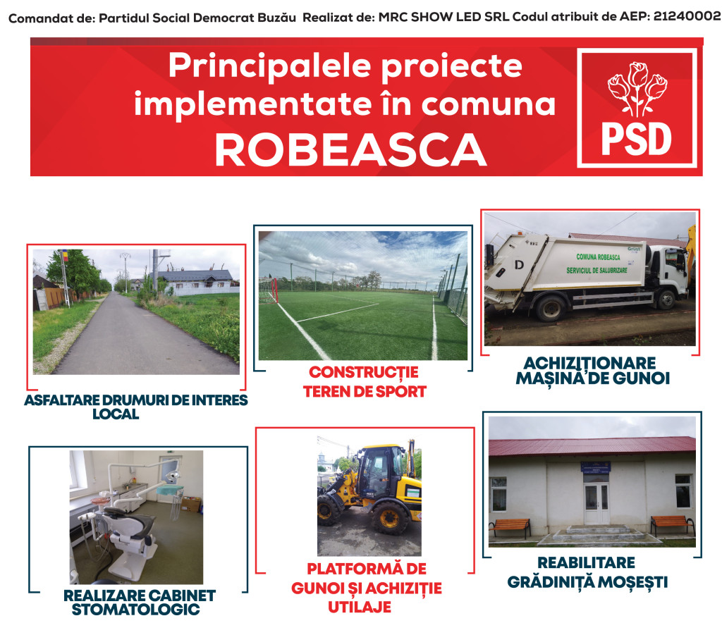 - Realizarea unui teren de sport în Satul Robeasca, cu nocturnă și gazon artificial.